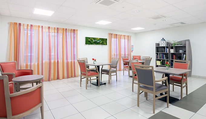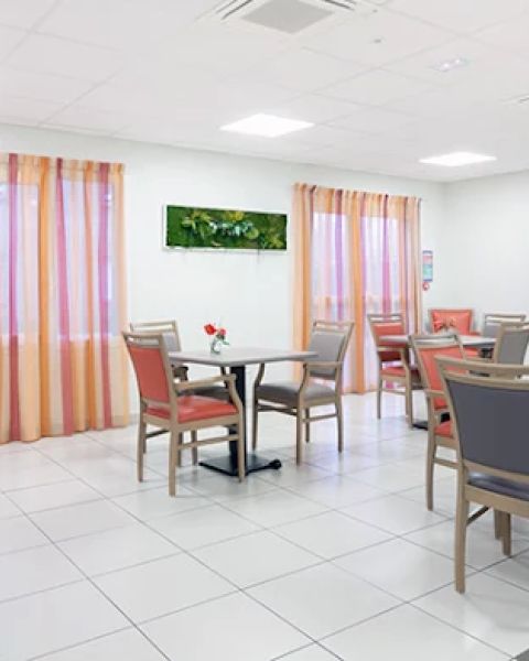 Les chambres individuelles de 19 m², meublées et personnalisables, permettent à chacun de recréer un véritable « chez-soi ». Les espaces communs – salons, bibliothèque, restaurant lumineux et grande terrasse ouverte sur un jardin aménagé – favorisent les moments de partage et le lien social.